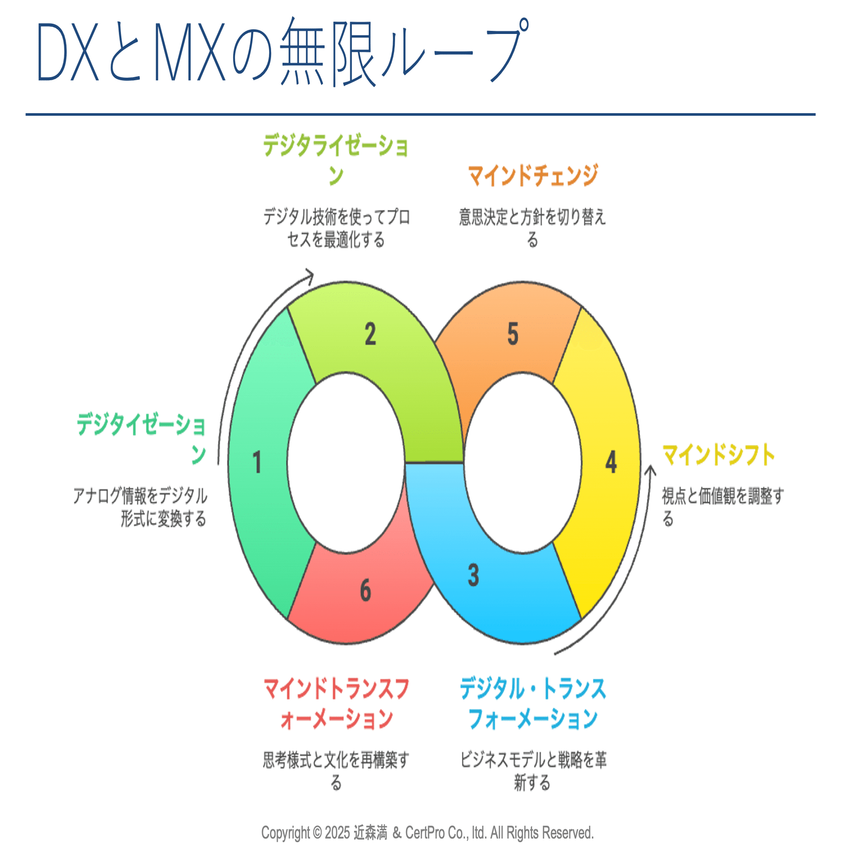 「マインド・トランスフォーメーション」とは、知識やスキル以前に、自身の思考パターンや価値観そのものをアップデートすることを指します。DX推進や生成AI活用が求められる今、変化に対して受動的な姿勢から、主体的・創造的に変化を受け入れる「学び直す心構え」こそが、最初に変えるべき“スキル”です。これは新時代の基礎リテラシーとも言える概念です。