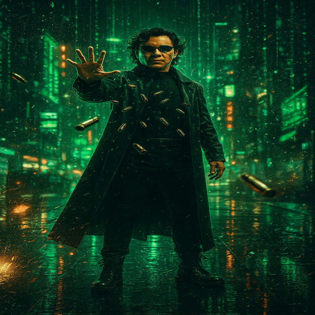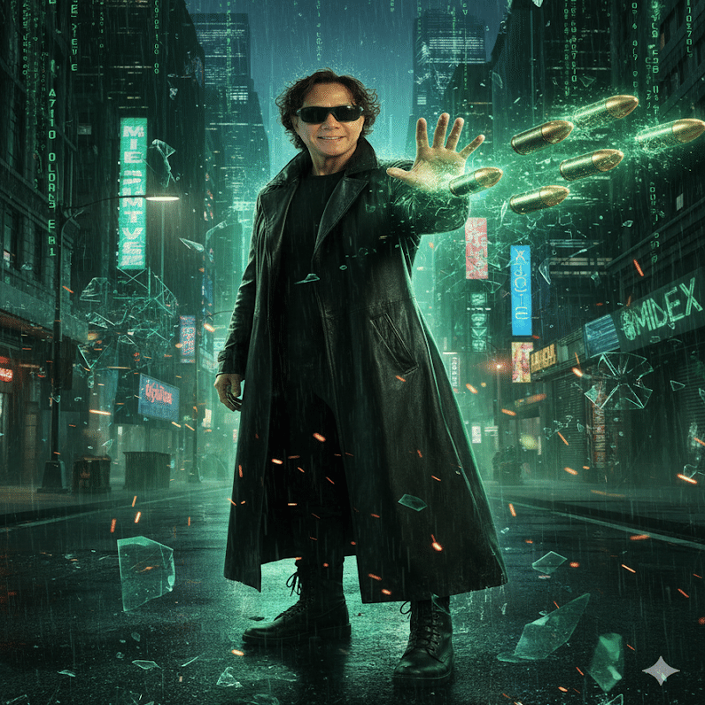 Gemini Nano Bananaを使ってみたところ、まず驚いたのが「写真そのままのような再現性」でした。具体的には、私の顔写真をアップロードし、『マトリックス』のネオ(キアヌ・リーブス)風のイメージで生成してみました。黒のトレンチコート、弾丸を避ける直前の立ち姿、背景はデジタルなグリーンコード。