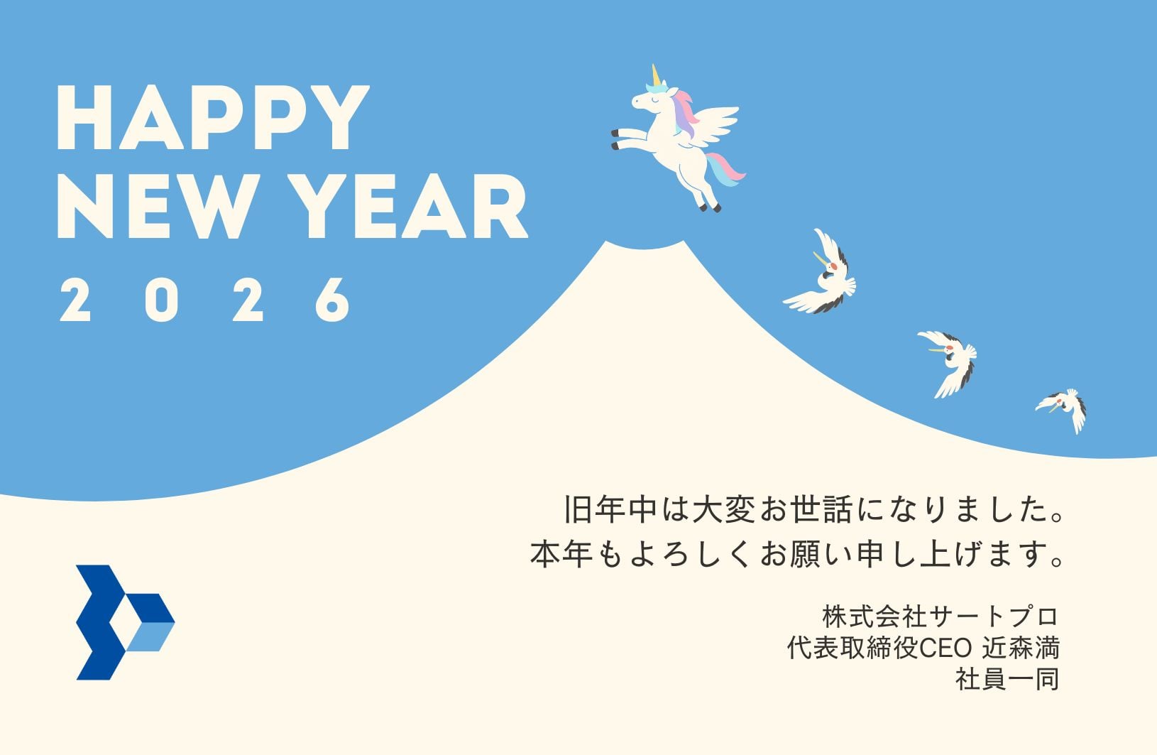 新年のご挨拶[株式会社サートプロ] ツイート Tweet 謹んで新年のお慶びを申し上げます。 旧年中はご愛顧を賜りましたこと厚く御礼申し上げます。 年頭に際し貴社益々のご発展をお祈りいたしますとともに 本年も倍旧のお引き立てのほど、どうぞよろしくお願い申し上げます。 2026年 新春 株式会社サートプロ 代表取締役CEO 近森 満 社員一同 ツイート